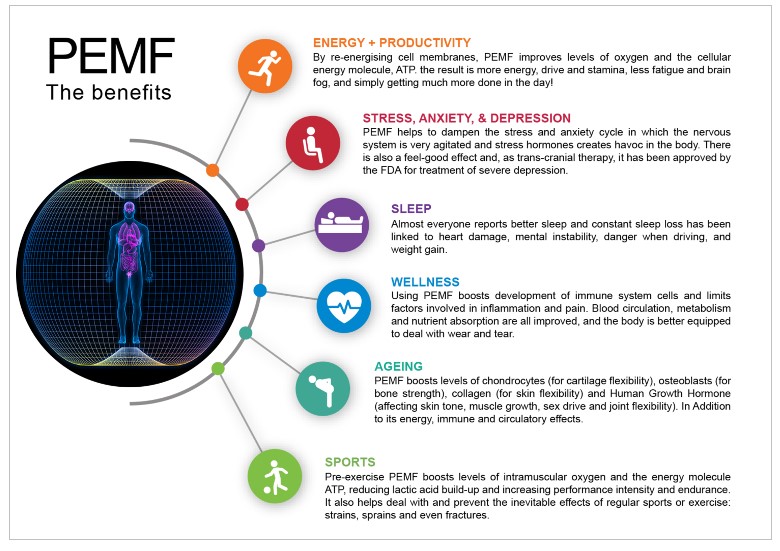 Pulsed Electromagnetic Field Therapy (PEMFT, or PEMF therapy), also known as Low-Frequency Magnetic Stimulation (LFMS), is one of the few modalities that offer a wide range of health-related benefits—from head to toe. Pulsation brings bio-resonance energy into the body.